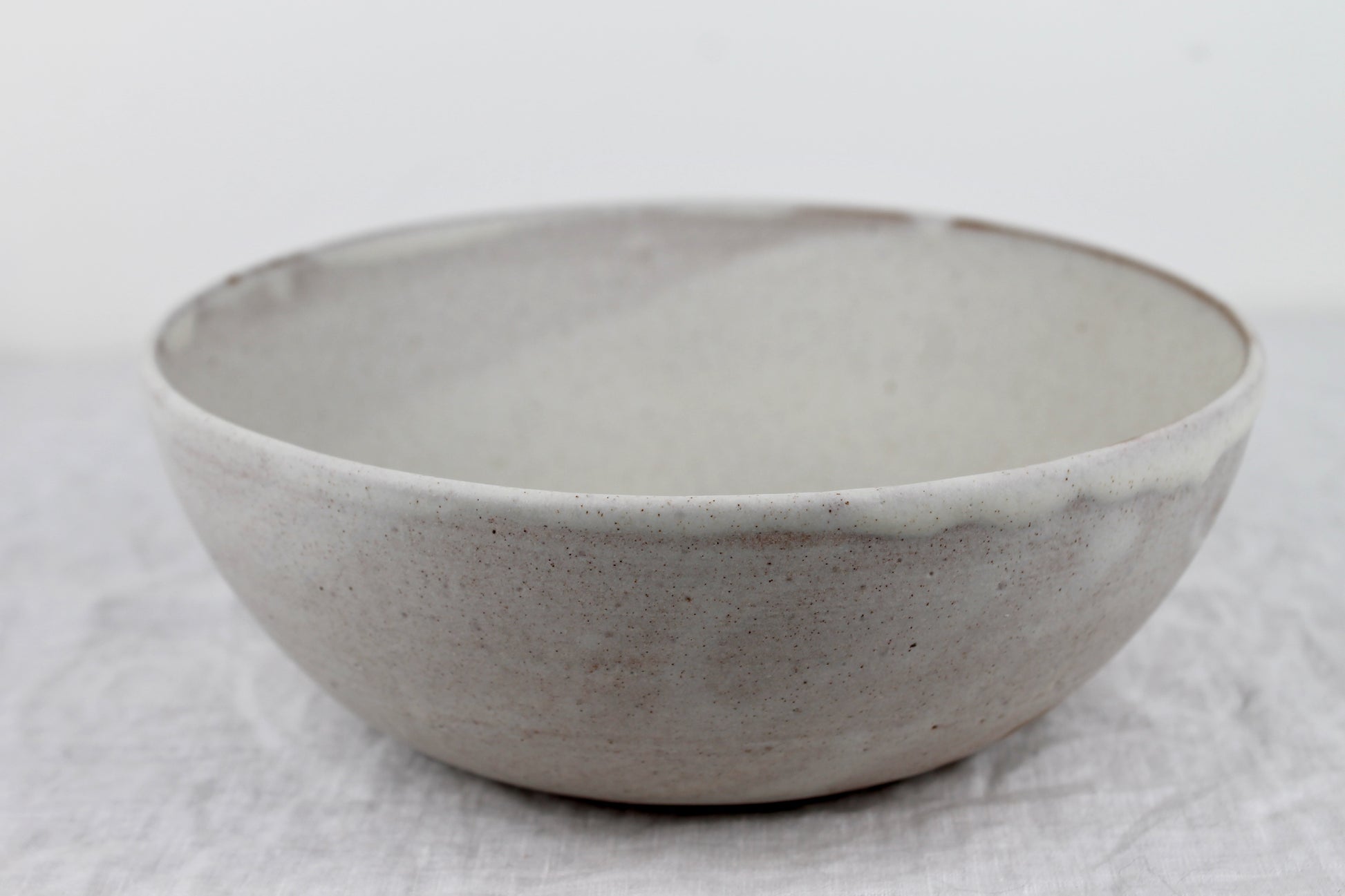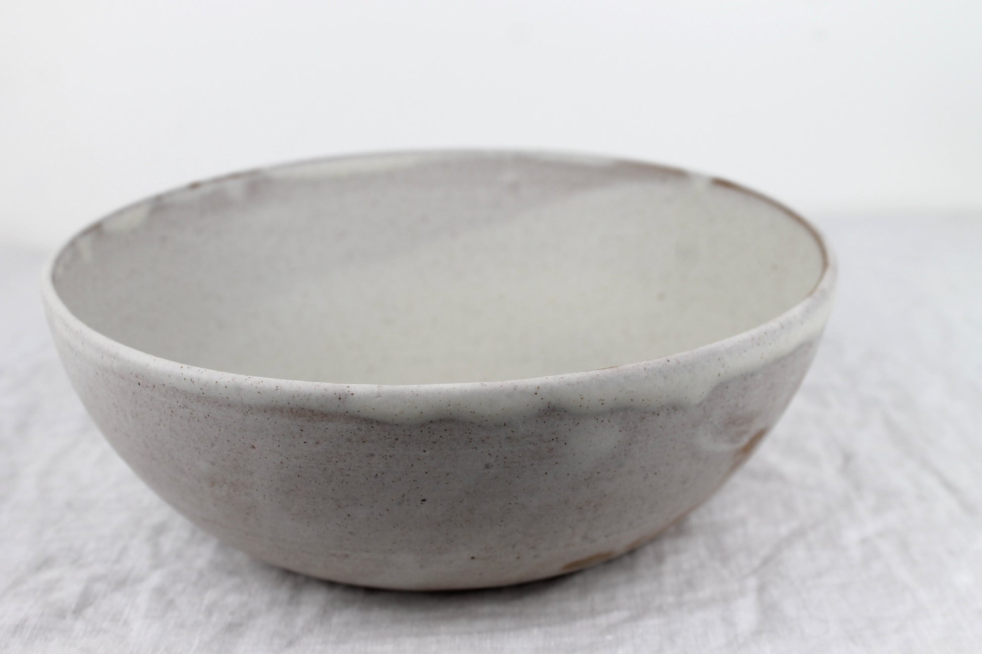 A medium sized bowl hand thrown with a rd brown clay and glazed in matte white created for displaying produce, serving sides/salads or as a mixing bowl in your kitchen.