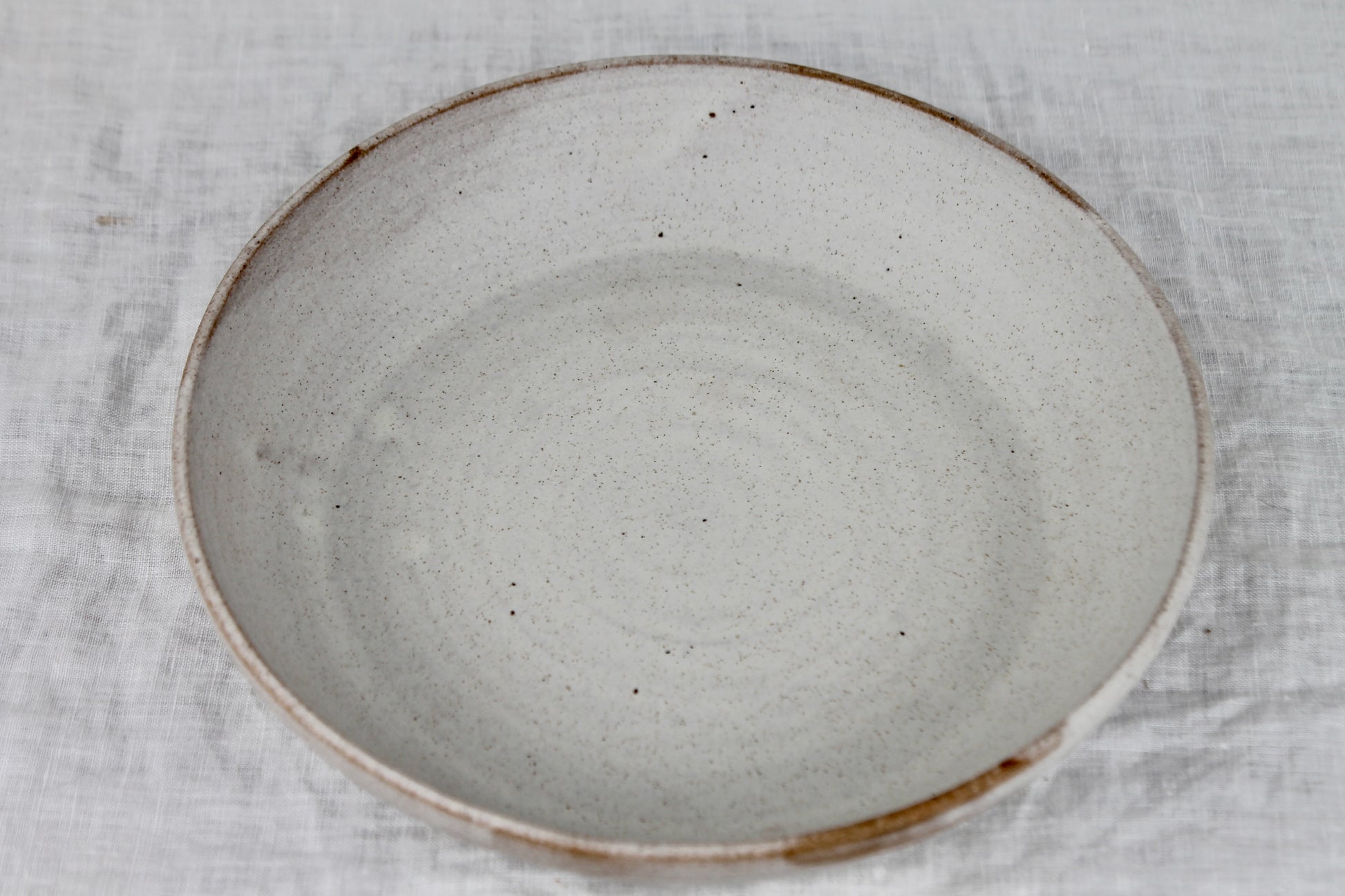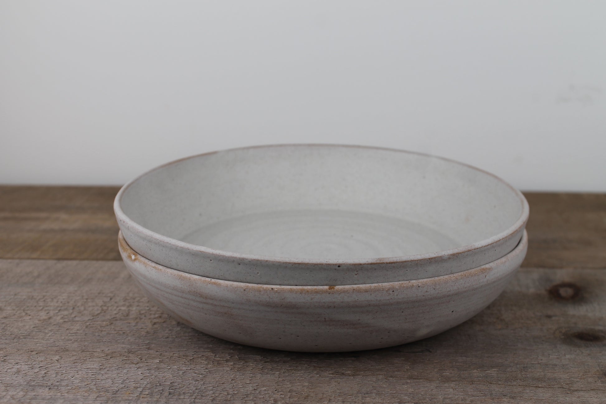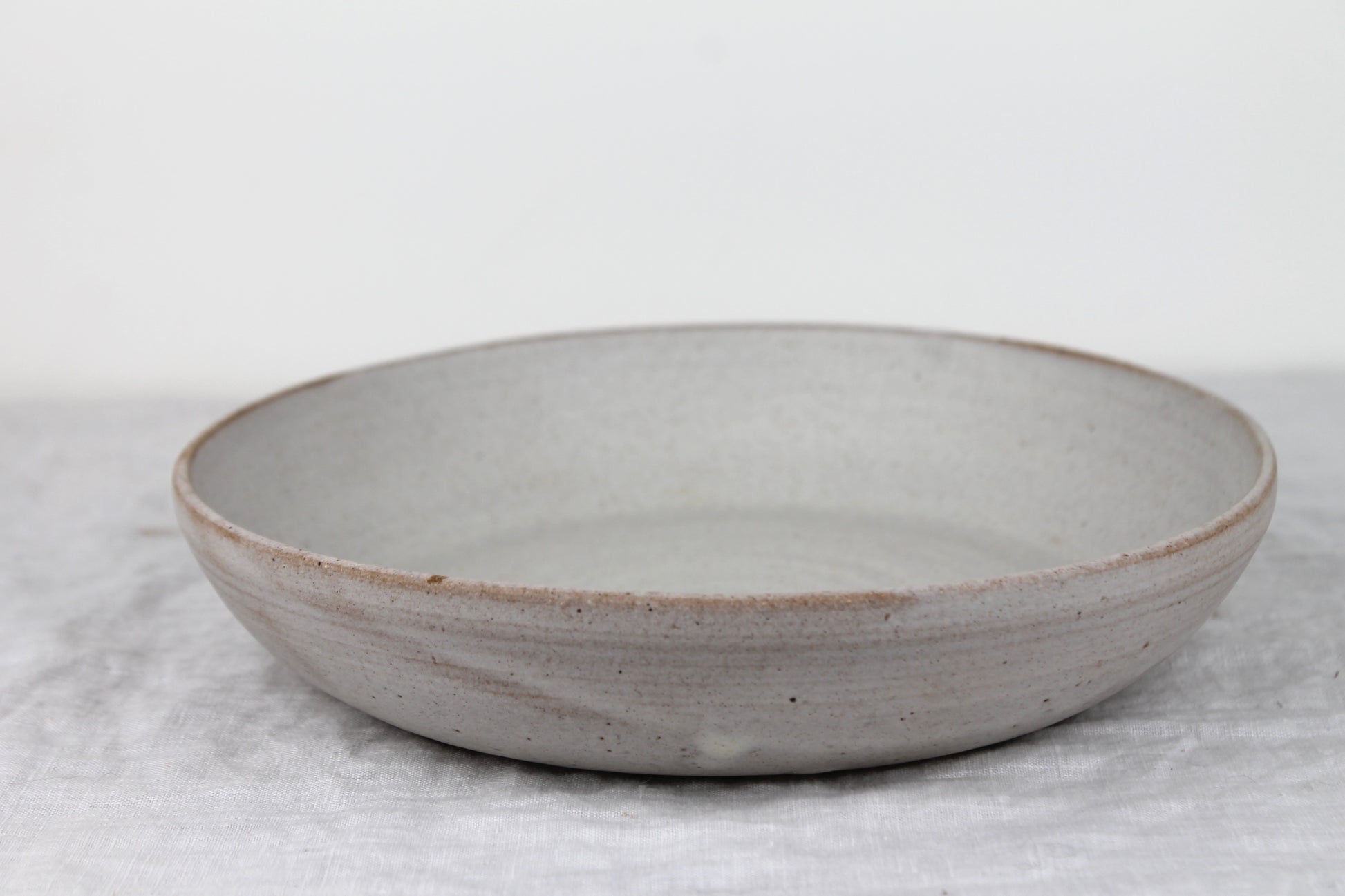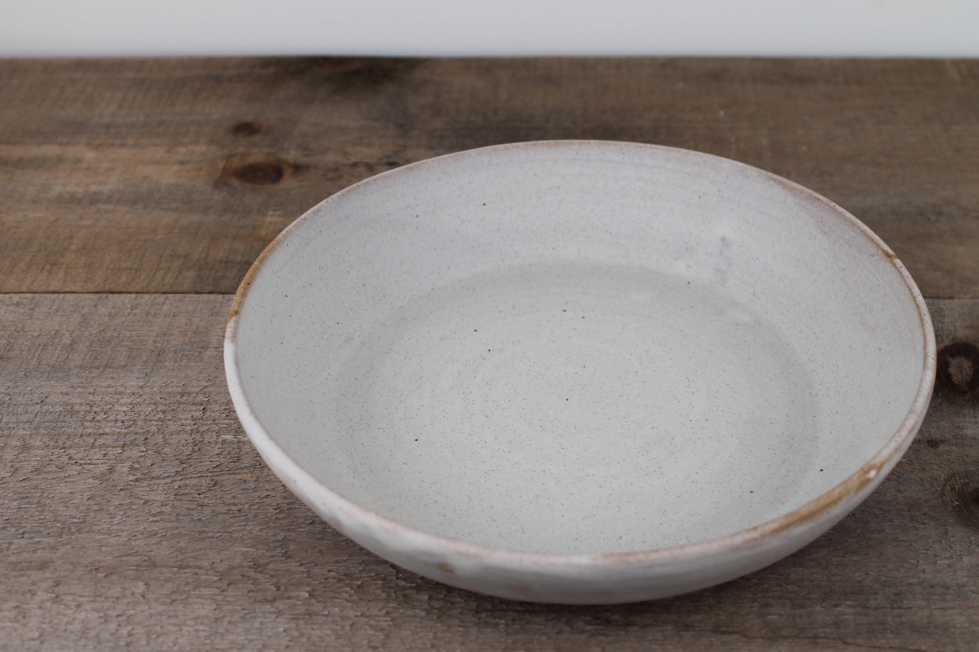 A hand thrown plate bowl made in a dark brown/red clay with a matte slightly speckled white glaze. Perfect for pasta or saucy dishes.