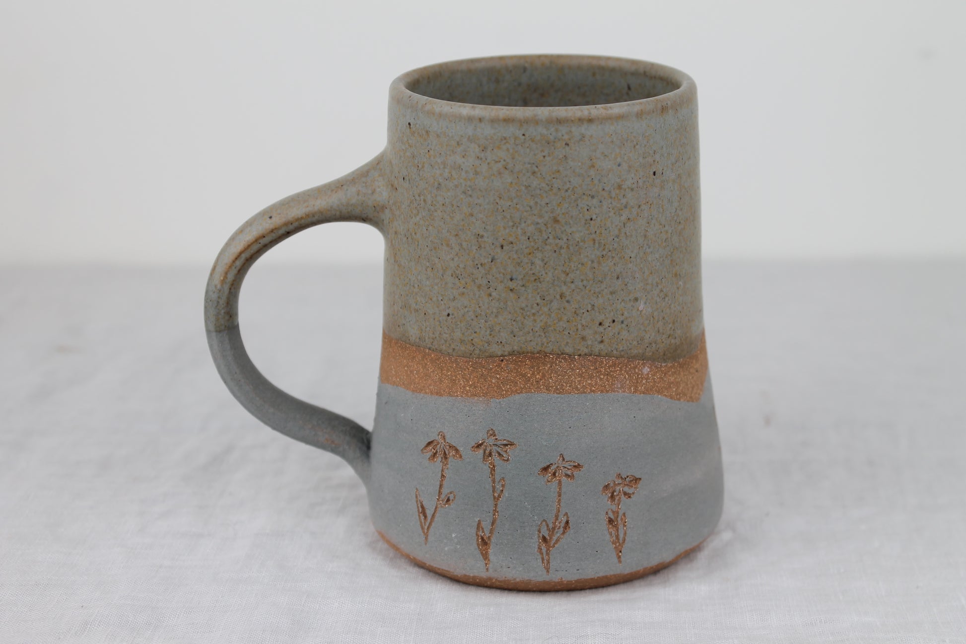 Each mug is hand thrown on the wheel, painted and carved with a unique meadow design featuring native grasses, flowers, and wildlife. This cup is glazed in a satin matte blue grey glaze on the top and inside.