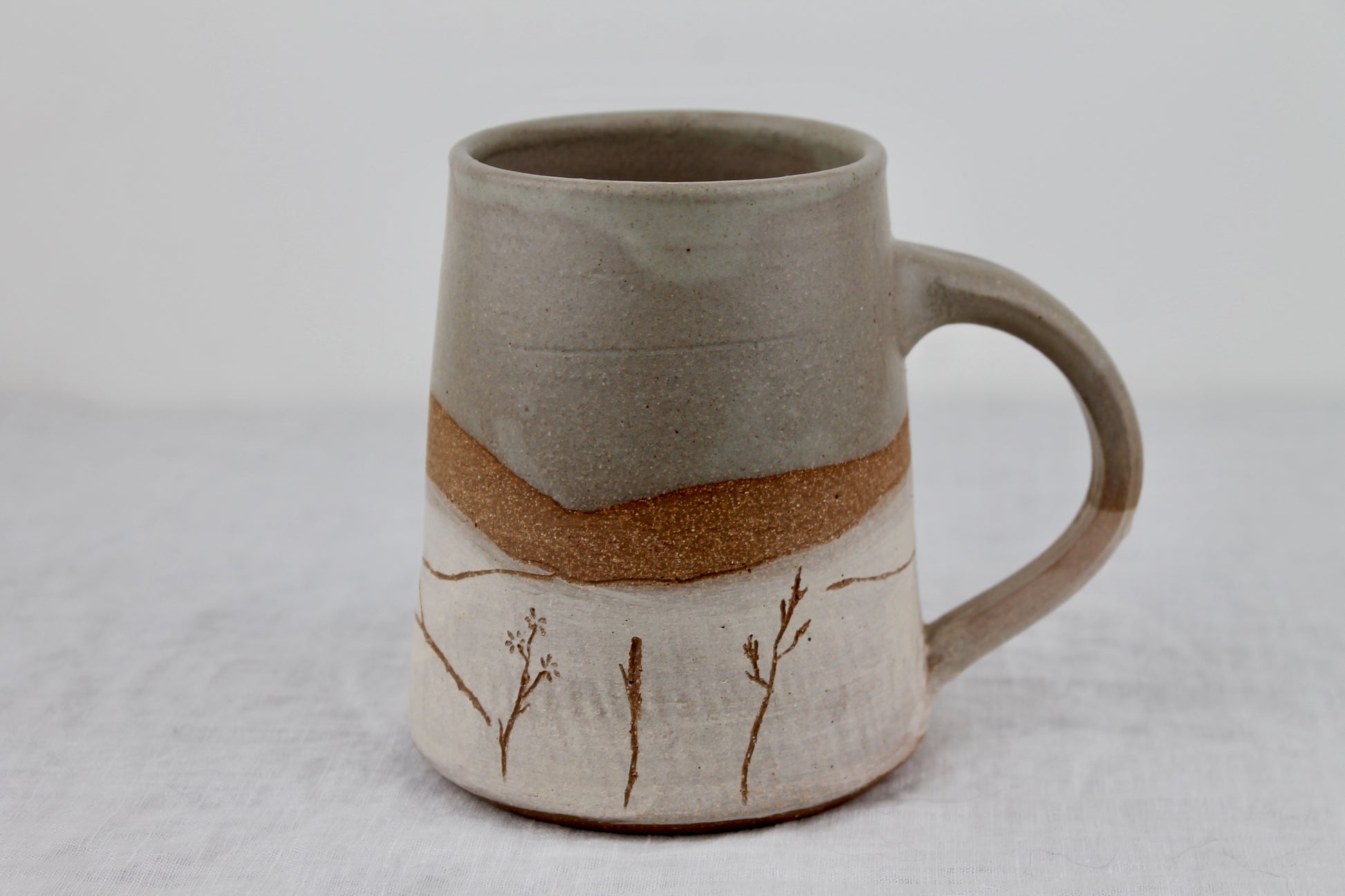Each mug is hand thrown on the wheel, painted and carved with a unique meadow design featuring native grasses, flowers, and wildlife. This cup is glazed in a satin cream/white glaze in the top and inside.