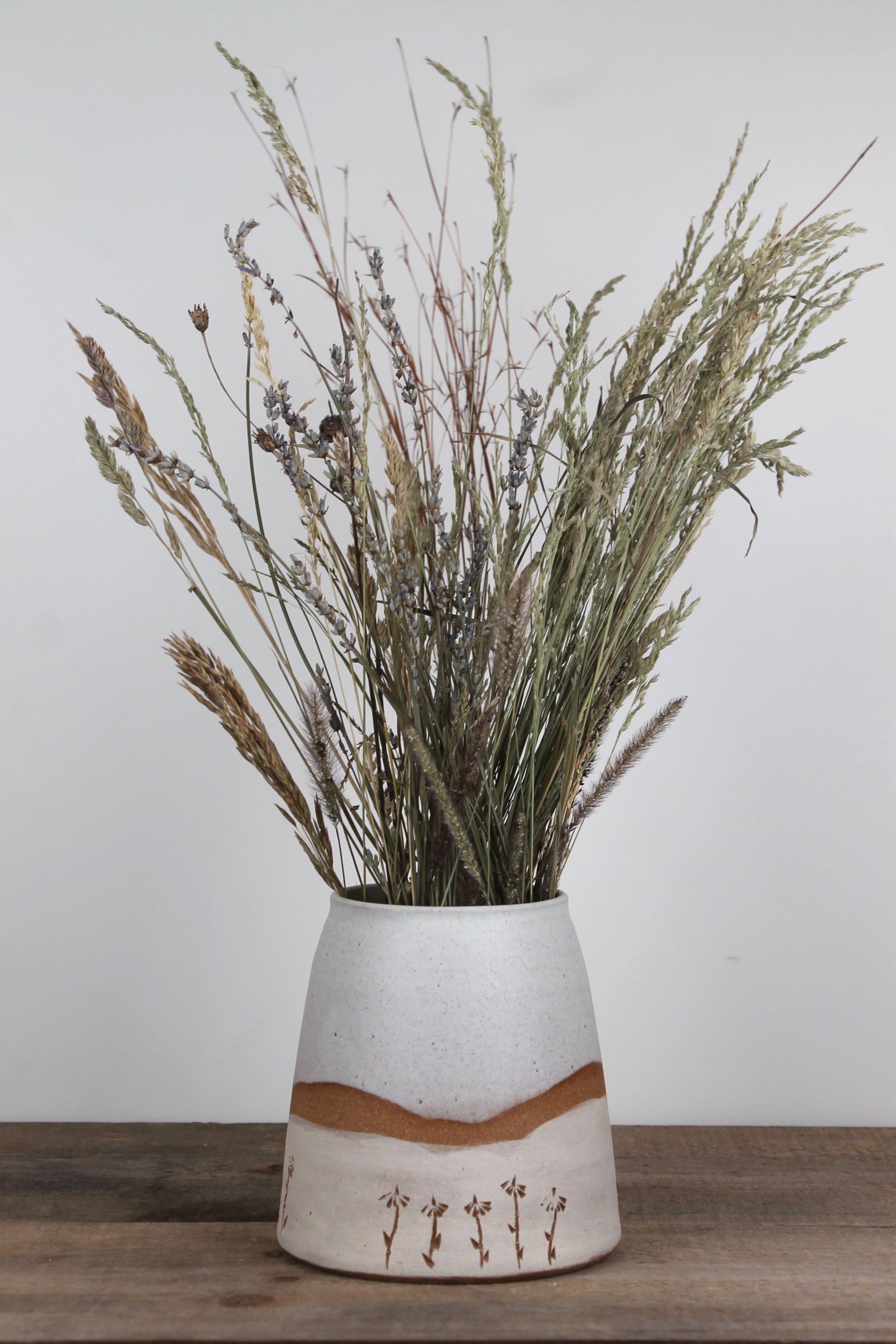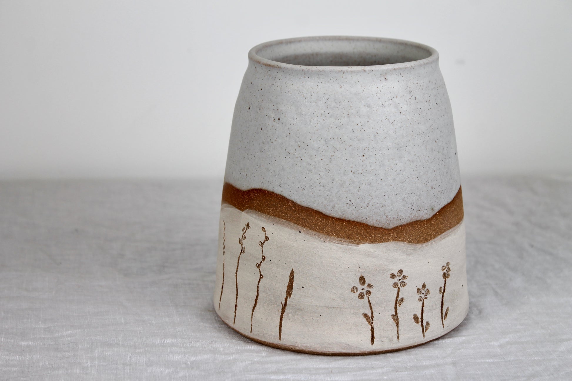 A large vase created for holding utensils or displaying collections of flowers or grasses. This vase is hand thrown on the wheel, painted and carved with a unique wildflower design, and glazed in a white matte glaze over a red brown clay.