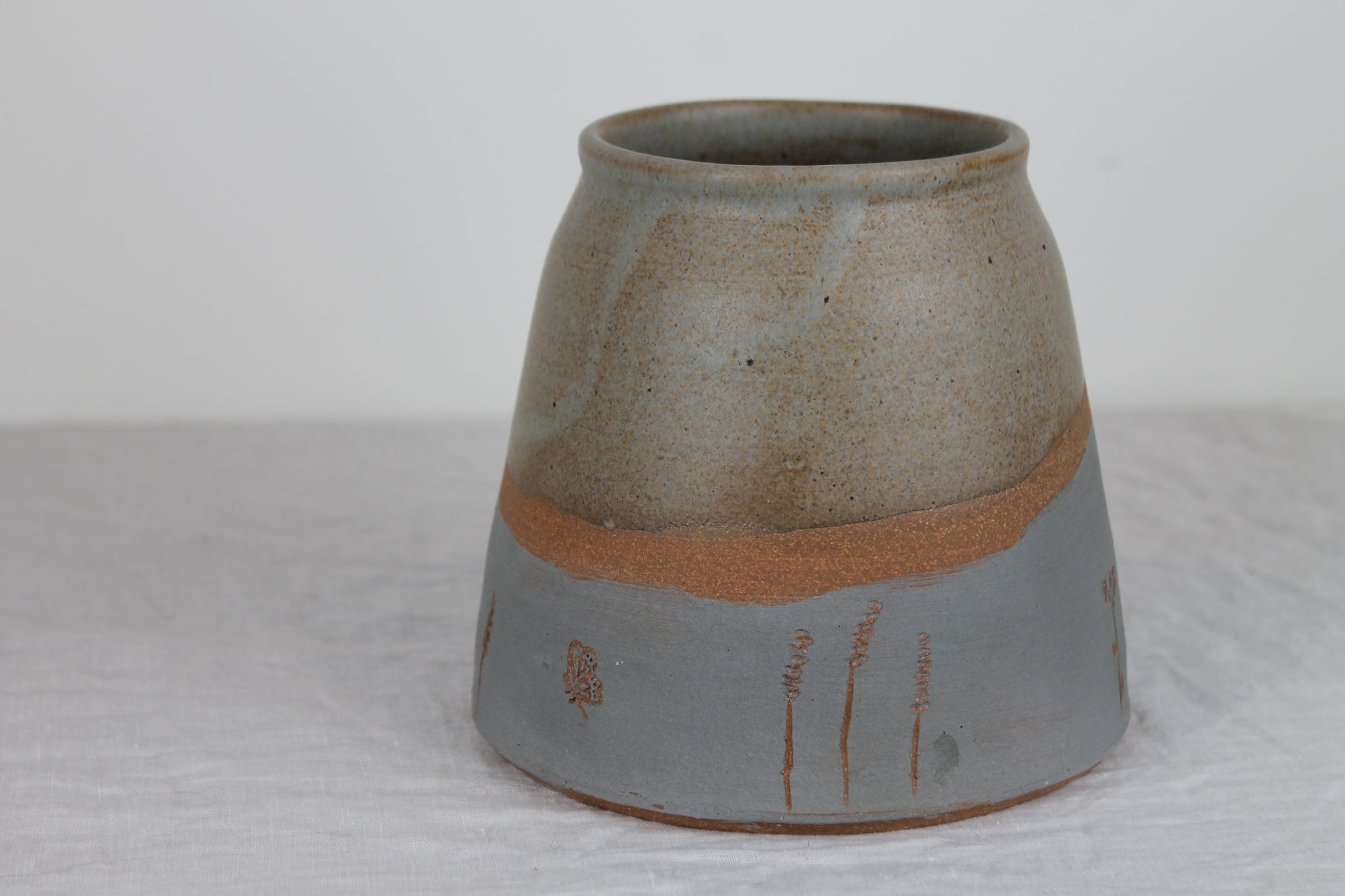 A large vase created for holding utensils or displaying collections of flowers or grasses. This vase is hand thrown on the wheel, painted and carved with a unique wildflower design, and glazed in a satin matte blue grey glaze over a red brown clay.