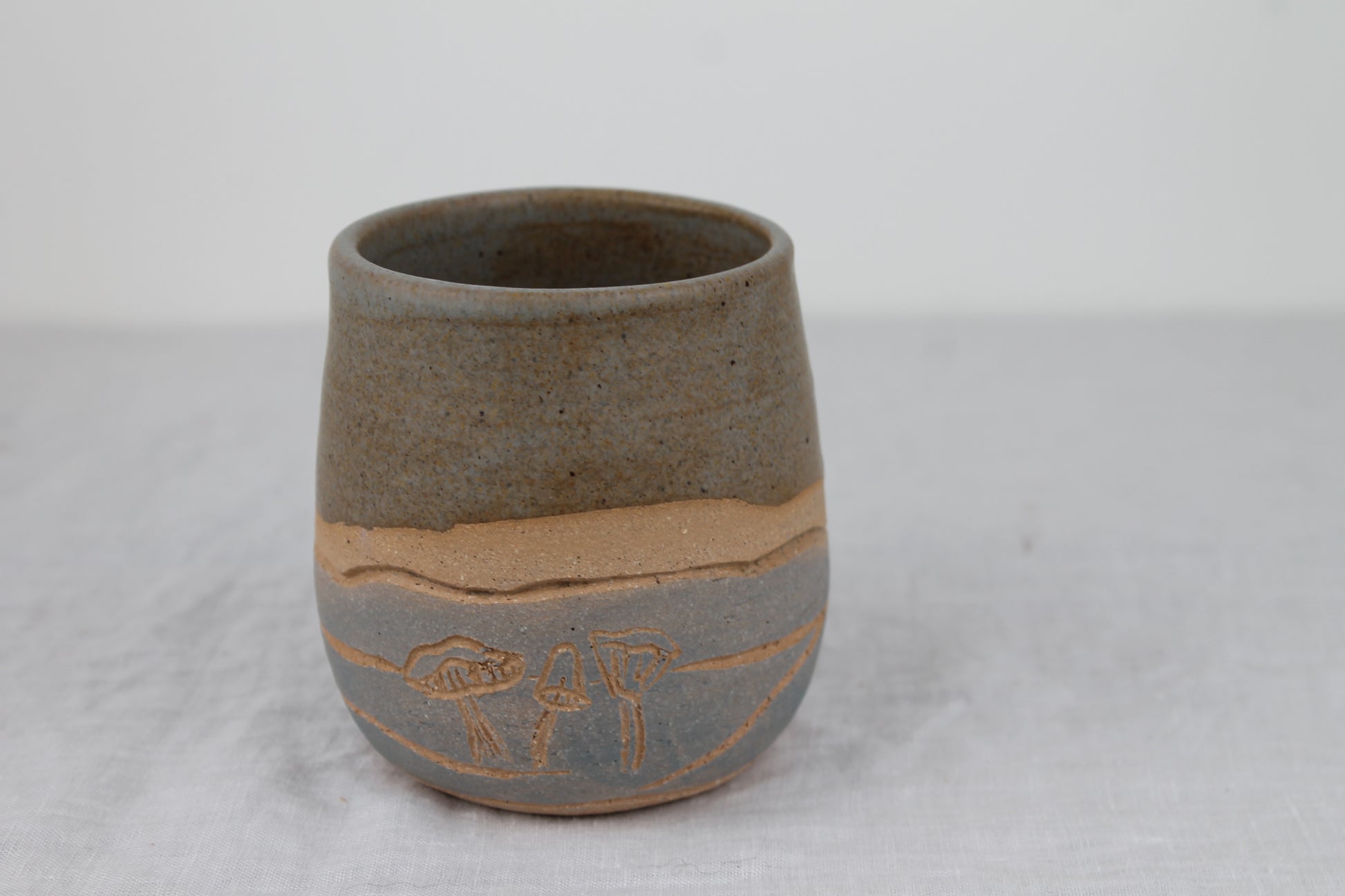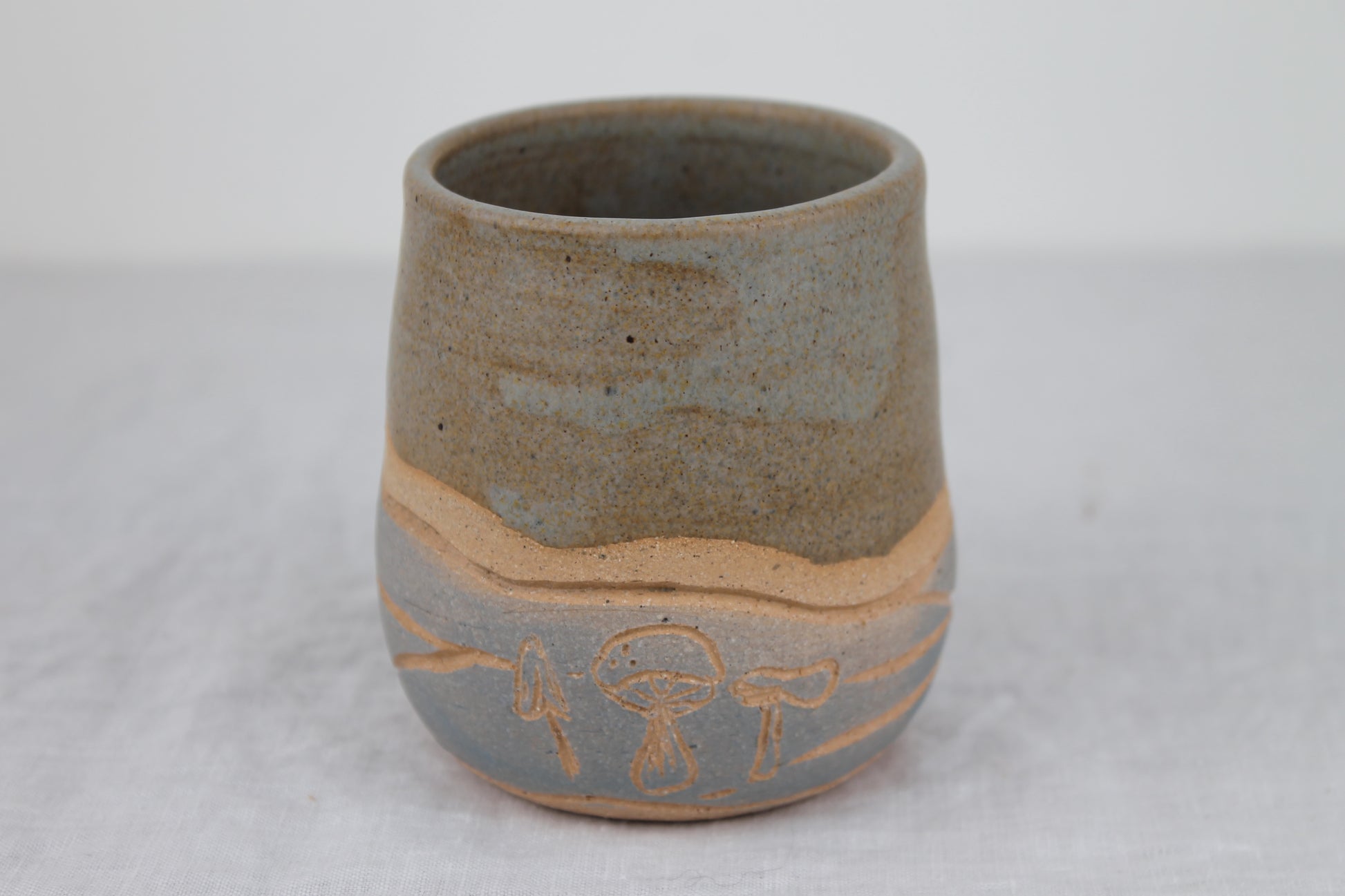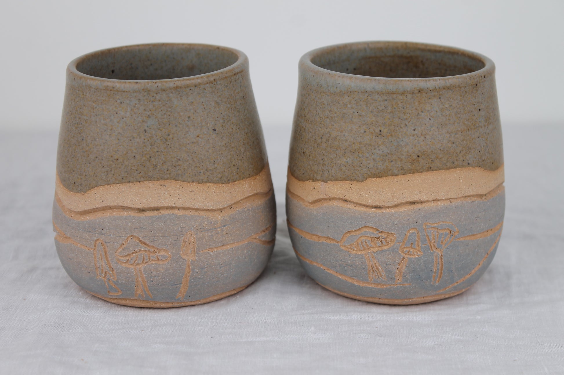 A pair of small rounded low cups perfect for your favorite warm or cold beverage. Each cup is hand thrown on the wheel, painted, carved with a unique mushroom design and then glazed with a satin matte blue grey glaze on the top half and inside.