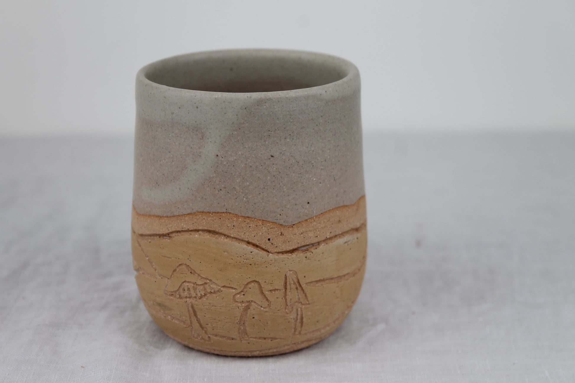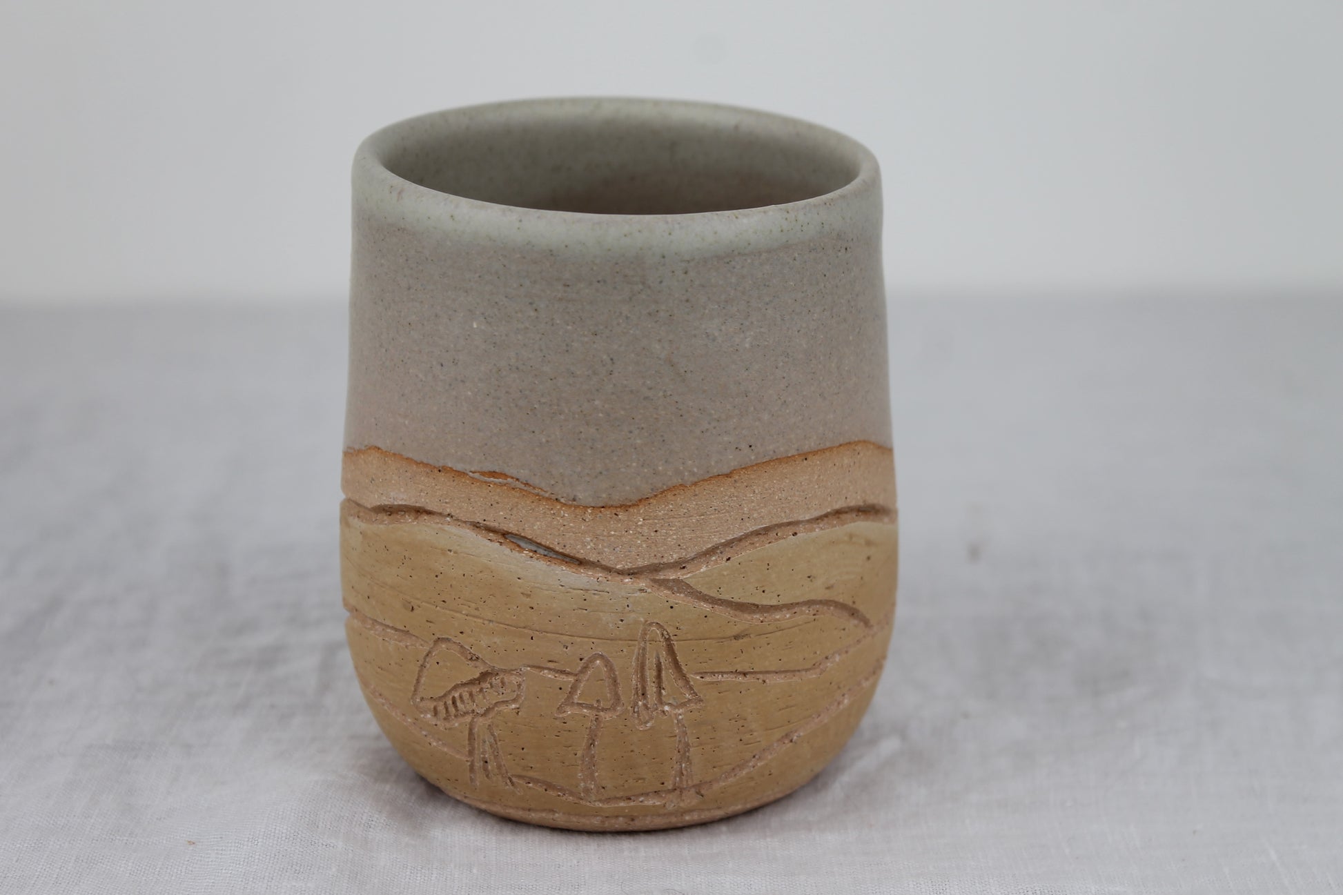 A pair of small rounded low cups perfect for your favorite warm or cold beverage. Each cup is hand thrown on the wheel, painted, carved with a unique mushroom design and then glazed with a satin matte cream/white glaze on the top half and inside.