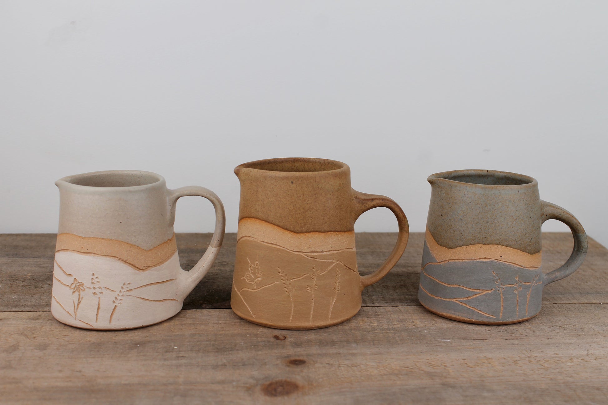 A small jug made for pouring sauces such as maple syrup, cream, or gravy. Each pourer is hand thrown on the wheel, hand painted, carved with a unique meadow design, and glazed on the top and inside with a matte honey glaze.