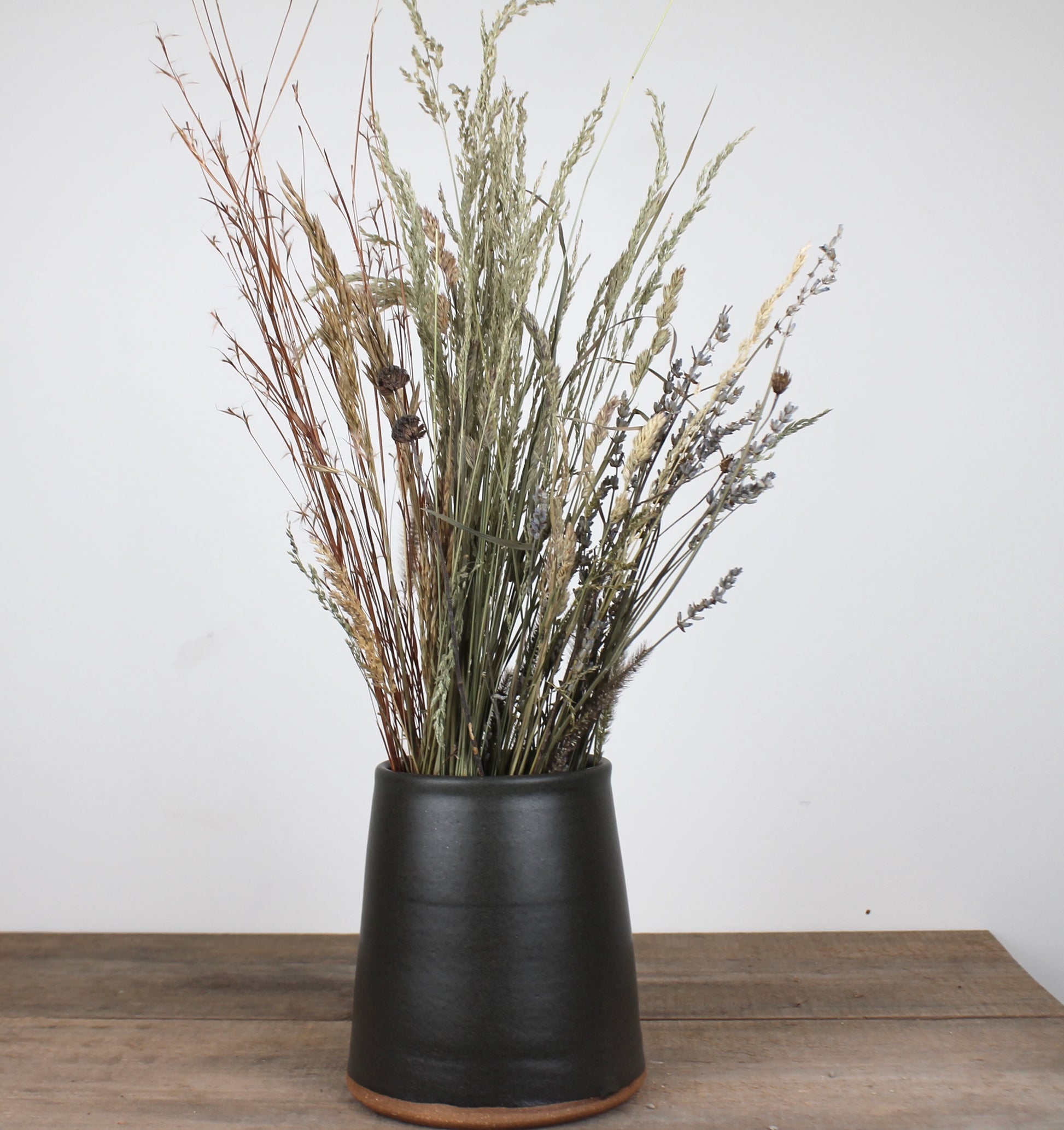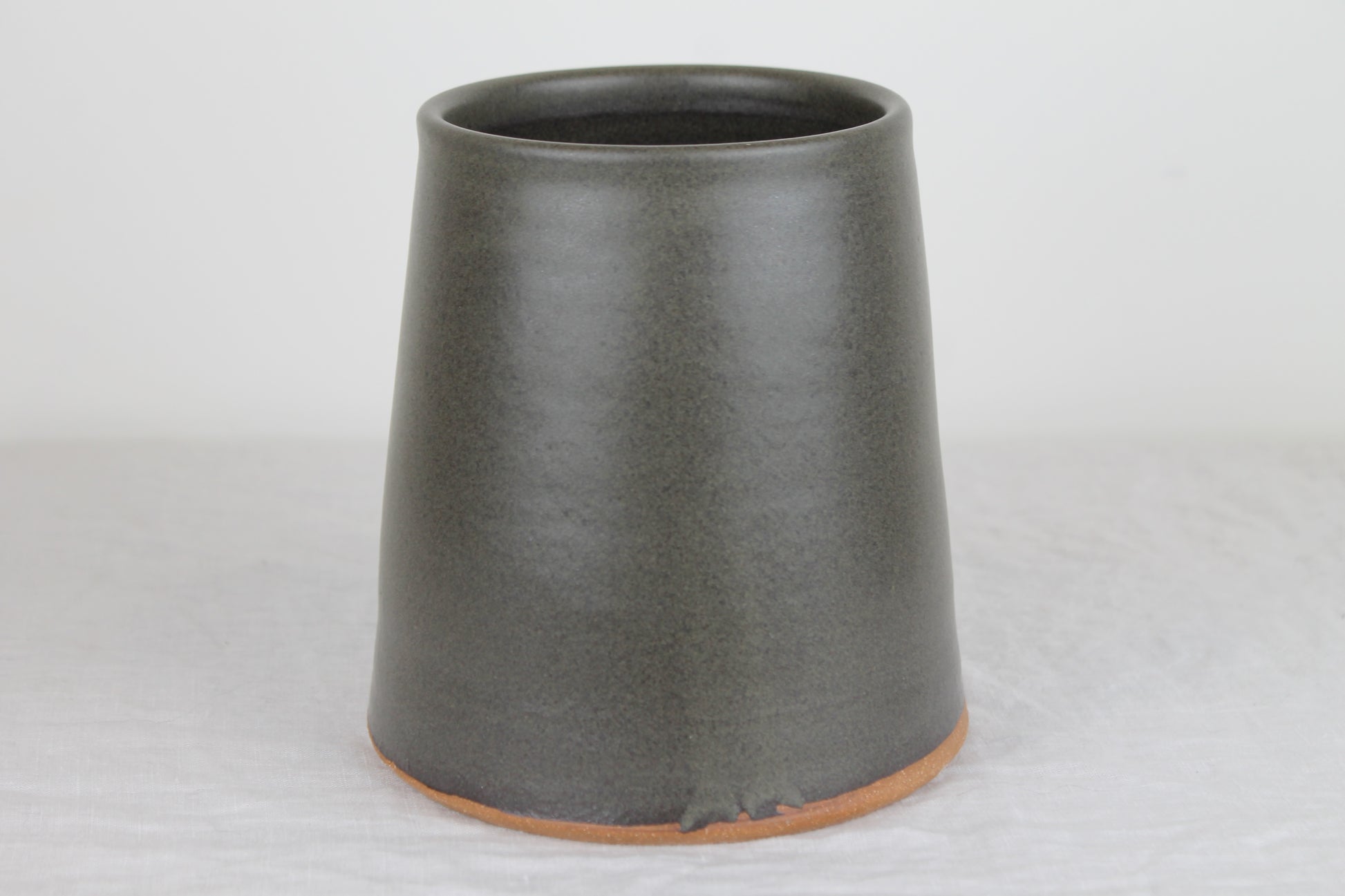 A large vase created for holding utensils or displaying collections of flowers or grasses. This vase is hand thrown on the wheel and glazed in a charcoal dark grey satin glaze over a red brown clay.