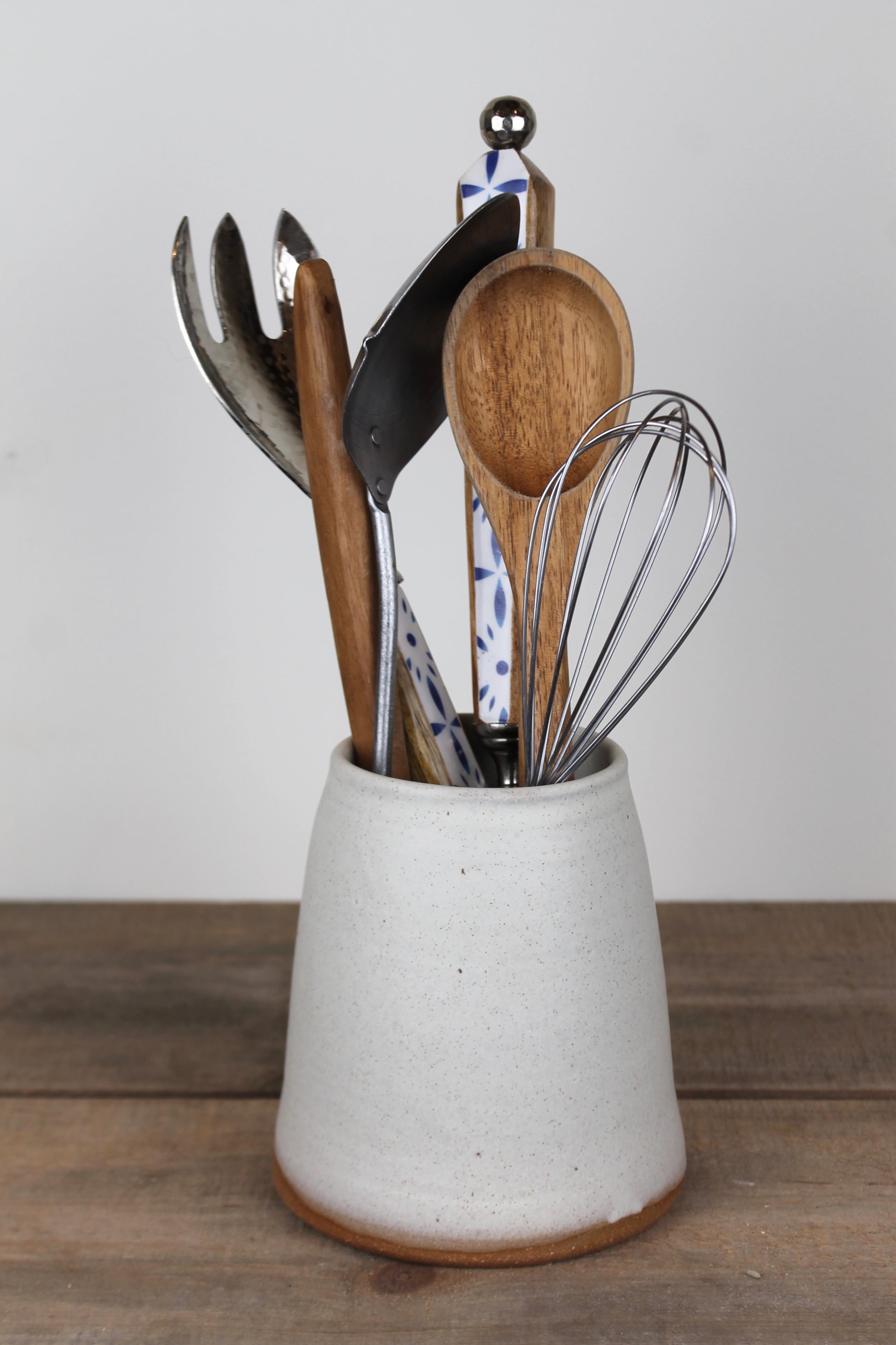 A large vase created for holding utensils or displaying collections of flowers or grasses. This vase is hand thrown on the wheel and glazed in a white matte glaze over a red brown clay.